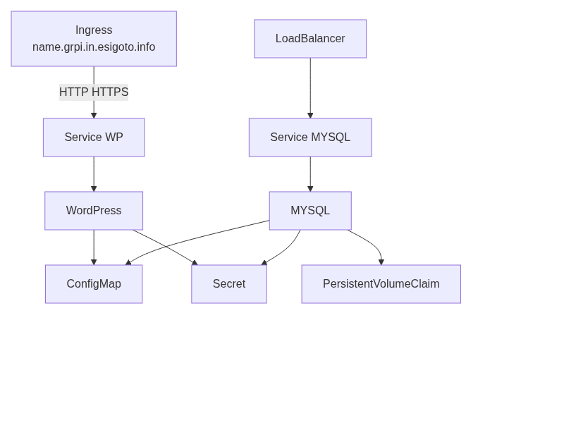 Déployer sur Kubernetes une application WordPress complète avec MySQL. Utiliser un Deployment (≥2 pods) et un Service pour WordPress (image personnalisée). Configurer un StatefulSet MySQL avec PVC et Service exposé en LoadBalancer. Mettre en place des Secrets/ConfigMaps injectés via variables d'environnement. Exposer WordPress via un Ingress sous <shortname>.grp.5clo1r.in.esigoto.info où <shortname> est un placeholder pour votre identifiant utilisateur.