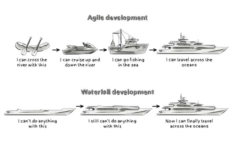 Passer de la cascade à l’agile, c’est changer de manière de voir le projet. Dans la cascade, on est dans une logique linéaire, planifiée, où l’on avance étape par étape comme un grand navire qui suit sa route. En agile, on est plus proche d’un voilier : on garde un cap, mais on ajuste en permanence la voile selon le vent et les conditions. Ce changement de référentiel, c’est accepter que l’incertitude fait partie du projet, et que l’adaptation est une force plutôt qu’un défaut.